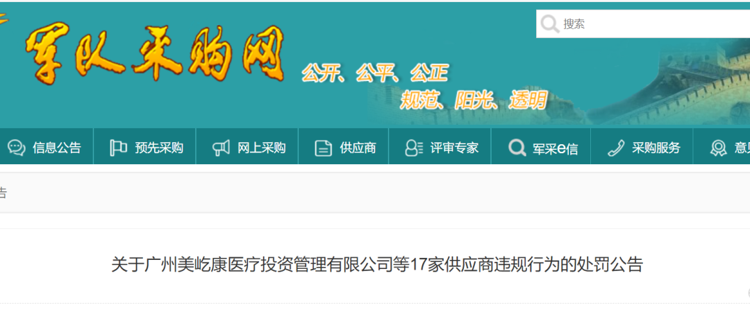 4月3日,军队采购网发布了《关于广州美屹康医疗投资管理有限公司等17家供应商违规行为的处罚公告》(以下简称《公告》)。