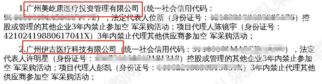 最终,广州美屹康医疗投资管理有限公司、广州伊吉医疗科技有限公司、河北康联医疗器械销售有限公司法定代表人控股或管理的其他企业3年内禁止参加空军采购活动;相关项目代理人同样3年内禁止代理其他供应商参加空军采购活动。