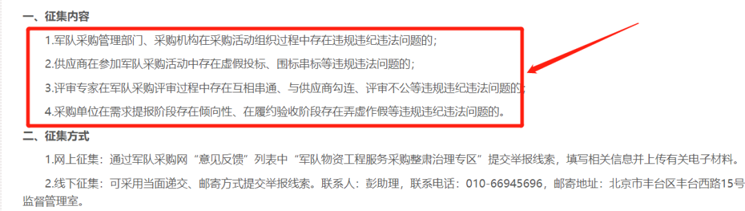 与此同时,为整治围标串标、虚假投标等军队采购突出问题,2022年10月,军队采购网开始公开征集“军队物资工程服务采购项目违规违纪违法问题线索”。