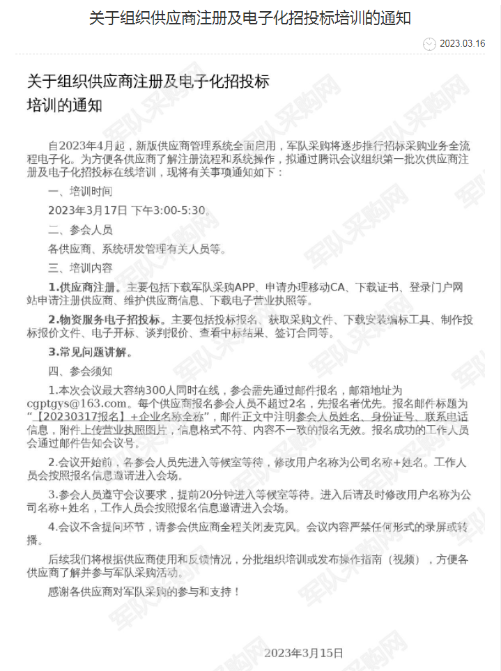3月16日,军队采购网发布公告:自2023年4月起,新版供应商管理系统全面启用,军队采购将逐步在全军推行采购业务全流程电子化。(具体见文末)